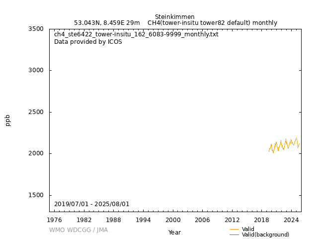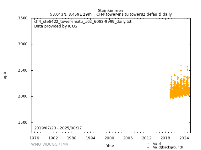 ICOS atmospheric station Observational timeseries of ambient mole fraction of CH4 in dry air, composed of (all whenever available) historical PI quality-checked data, ICOS Level 2 data and ICOS NRT data. The following uncertainty estimates are used: a. Continuous Measurement Repeatability: monthly average of the standard deviations of short-term target raw data over 1-minute intervals b. Long Term Repeatability: standard deviation of the averaged short-term target measurement intervals (of 10 minutes every 5 hours approximately) over three days c. Short Term Target Bias: difference between the hourly average of the short-term target injections and the value assigned by the calibration lab The method used for "value_unc_1" is "Continuous Measurement Repeatability". The method used for "value_unc_2" is "Long Term Repeatability". The method used for "value_unc_3" is "Short Term Target Bias". More information about the uncertainty estimates can be found in Yver Kwok et al. (2015) (https://doi.org/10.5194/amt-8-3867-2015) and Yver-Kwok et al. (2021) (https://amt.copernicus.org/articles/14/89/2021/). PID: 11676/LmpIWcveJRIktpiSR0ekszxh Citation: ICOS RI, Bergamaschi, P., Colomb, A., De Mazière, M., Emmenegger, L., Harris, E., Kubistin, D., Lehner, I., Lehtinen, K., Leuenberger, M., Lund Myhre, C., Marek, M.V., O'Doherty, S., Platt, S.M., Plaß-Dülmer, C., Ramonet, M., Rennick, C., Schmidt, M., Stanley, K., di Sarra, A., Apadula, F., Arnold, S., Blanc, P.-E., Blessing, C., Brunner, D., Chen, H., Chmura, L., Conil, S., Couret, C., Cristofanelli, P., Delmotte, M., Di Iorio, T., Forster, G., Frumau, A., Gerbig, C., Gheusi, F., Hammer, S., Haszpra, L., Hatakka, J., Heliasz, M., Henne, S., Hensen, A., Hermansen, O., Hoheisel, A., Jagoda, P., Joly, L., Kneuer, T., Larmanou, E., Laurila, T., Leskinen, A., Levin, I., Levula, J., Lindauer, M., Lopez, D., Lopez, M., Lunder, C., Mammarella, I., Manca, G., Manning, A., Marklund, P., Martin, D., Meinhardt, F., Molder, M., Molnár, M., Müller-Williams, J., Noe, S.M., Nęcki, J., Ottosson-Löfvenius, M., Philippon, C., Piacentino, S., Pitt, J., Rivas-Soriano, P., Scheeren, B., Schumacher, M., Sha, M.K., Smith, P., Spain, G., Steinbacher, M., Sørensen, L.L., Vermeulen, A., Vítková, G., Xueref-Remy, I., Ylisirniö, A., Yver-Kwok, C., Zwerschke, E., Arriga, N., Conen, F., Kazan, V., Roulet, Y.-A., Biermann, T., Heltai, D., Komínková, K., Laurent, O., Miettinen, P., Montaguti, S., Morguí, J.-A., Pichon, J.-M., Sferlazzo, D., Trisolino, P., Zazzeri, G., Blandin, E., Bracci, A., Busetto, M., Bán, S., Bäni, L., Calzolari, F., Elsasser, M., Fratticioli, C., Friedli, J., Fuente-Lastra, M., Gest, L., Grossmann, J., Hanuš, V., Helle, J., Hermans, C., Keronen, P., Kolari, P., Kumps, N., Laitinen, A., Langrene, L., Lanza, A., Legendre, V., Mandrick, Z., Metzger, J.-M., Rigouleau, L.-J., Schreiber, M., Steger, D., Taipale, R., Weyrauch, D., van den Bulk, P., Álvarez Hernández, A., ICOS Carbon Portal, ICOS Atmosphere Thematic Centre, ICOS Flask And Calibration Laboratory, ICOS Central Radiocarbon Laboratory, 2025. European Obspack compilation of atmospheric methane data from ICOS and non-ICOS European stations for the period 1984-2025; obspack_ch4_466_GVeu_v11.0_20250818. https://doi.org/10.18160/X5ZG-C3WE DATA POLICY: ICOS data is licensed under a Creative Commons Attribution 4.0 international licence (https://creativecommons.org/licenses/by/4.0/). ICOS data licence is described at https://data.icos-cp.eu/licence. |