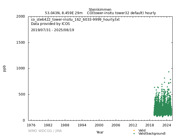 ICOS atmospheric station Observational timeseries of ambient mole fraction of CO in dry air, composed of (all whenever available) historical PI quality-checked data, ICOS Level 2 data and ICOS NRT data. The following uncertainty estimates are used: a. Continuous Measurement Repeatability: monthly average of the standard deviations of short-term target raw data over 1-minute intervals b. Long Term Repeatability: standard deviation of the averaged short-term target measurement intervals (of 10 minutes every 5 hours approximately) over three days c. Short Term Target Bias: difference between the hourly average of the short-term target injections and the value assigned by the calibration lab The method used for "value_unc_1" is "Continuous Measurement Repeatability". The method used for "value_unc_2" is "Long Term Repeatability". The method used for "value_unc_3" is "Short Term Target Bias". More information about the uncertainty estimates can be found in Yver Kwok et al. (2015) (https://doi.org/10.5194/amt-8-3867-2015) and Yver-Kwok et al. (2021) (https://amt.copernicus.org/articles/14/89/2021/). PID: 11676/eryiTsrE7bsgzndBpmyeGJeK Citation: ICOS RI, Bergamaschi, P., Colomb, A., De Mazière, M., Emmenegger, L., Harris, E., Kubistin, D., Lehner, I., Lehtinen, K., Leuenberger, M., Lund Myhre, C., Marek, M.V., O'Doherty, S., Platt, S.M., Plaß-Dülmer, C., Ramonet, M., Schmidt, M., Stanley, K., di Sarra, A., Apadula, F., Arnold, S., Blessing, C., Chen, H., Conil, S., Couret, C., Cristofanelli, P., Di Iorio, T., Forster, G., Frumau, A., Hatakka, J., Heliasz, M., Hensen, A., Hermansen, O., Hoheisel, A., Kneuer, T., Larmanou, E., Laurila, T., Leskinen, A., Levula, J., Lindauer, M., Lopez, M., Lunder, C., Mammarella, I., Manca, G., Manning, A., Marklund, P., Meinhardt, F., Molder, M., Müller-Williams, J., Ottosson-Löfvenius, M., Piacentino, S., Pitt, J., Rivas-Soriano, P., Scheeren, B., Schumacher, M., Sha, M.K., Smith, P., Steinbacher, M., Vermeulen, A., Vítková, G., Ylisirniö, A., Yver-Kwok, C., Zwerschke, E., Arriga, N., Conen, F., Kazan, V., Roulet, Y.-A., Biermann, T., Delmotte, M., Heltai, D., Komínková, K., Laurent, O., Miettinen, P., Montaguti, S., Pichon, J.-M., Sferlazzo, D., Trisolino, P., Zazzeri, G., Blandin, E., Bracci, A., Busetto, M., Bäni, L., Calzolari, F., Elsasser, M., Fratticioli, C., Friedli, J., Fuente-Lastra, M., Gest, L., Grossmann, J., Hanuš, V., Helle, J., Hermans, C., Keronen, P., Kolari, P., Kumps, N., Laitinen, A., Langrene, L., Lanza, A., Legendre, V., Lopez, D., Mandrick, Z., Metzger, J.-M., Rigouleau, L.-J., Schreiber, M., Steger, D., Taipale, R., Weyrauch, D., van den Bulk, P., Álvarez Hernández, A., ICOS Carbon Portal, ICOS Atmosphere Thematic Centre, ICOS Flask And Calibration Laboratory, ICOS Central Radiocarbon Laboratory, 2025. European Obspack compilation of atmospheric carbon monoxide data from ICOS and non-ICOS European stations for the period 2016-2025; obspack_co_466_GVeu_v11.0_20250821. https://doi.org/10.18160/M3VW-DRM5 DATA POLICY: ICOS data is licensed under a Creative Commons Attribution 4.0 international licence (https://creativecommons.org/licenses/by/4.0/). ICOS data licence is described at https://data.icos-cp.eu/licence. |