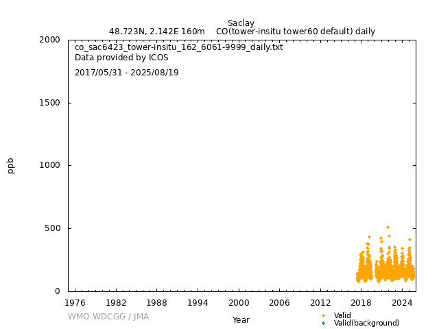 ICOS atmospheric station Observational timeseries of ambient mole fraction of CO in dry air, composed of (all whenever available) historical PI quality-checked data, ICOS Level 2 data and ICOS NRT data. The following uncertainty estimates are used: a. Continuous Measurement Repeatability: monthly average of the standard deviations of short-term target raw data over 1-minute intervals b. Long Term Repeatability: standard deviation of the averaged short-term target measurement intervals (of 10 minutes every 5 hours approximately) over three days c. Short Term Target Bias: difference between the hourly average of the short-term target injections and the value assigned by the calibration lab The method used for "value_unc_1" is "Continuous Measurement Repeatability". The method used for "value_unc_2" is "Long Term Repeatability". The method used for "value_unc_3" is "Short Term Target Bias". More information about the uncertainty estimates can be found in Yver Kwok et al. (2015) (https://doi.org/10.5194/amt-8-3867-2015) and Yver-Kwok et al. (2021) (https://amt.copernicus.org/articles/14/89/2021/). PID: 11676/ymYAcu-u8jAh1K7ueGzNEHa- Citation: ICOS RI, Bergamaschi, P., Colomb, A., De Mazière, M., Emmenegger, L., Harris, E., Kubistin, D., Lehner, I., Lehtinen, K., Leuenberger, M., Lund Myhre, C., Marek, M.V., O'Doherty, S., Platt, S.M., Plaß-Dülmer, C., Ramonet, M., Schmidt, M., Stanley, K., di Sarra, A., Apadula, F., Arnold, S., Blessing, C., Chen, H., Conil, S., Couret, C., Cristofanelli, P., Di Iorio, T., Forster, G., Frumau, A., Hatakka, J., Heliasz, M., Hensen, A., Hermansen, O., Hoheisel, A., Kneuer, T., Larmanou, E., Laurila, T., Leskinen, A., Levula, J., Lindauer, M., Lopez, M., Lunder, C., Mammarella, I., Manca, G., Manning, A., Marklund, P., Meinhardt, F., Molder, M., Müller-Williams, J., Ottosson-Löfvenius, M., Piacentino, S., Pitt, J., Rivas-Soriano, P., Scheeren, B., Schumacher, M., Sha, M.K., Smith, P., Steinbacher, M., Vermeulen, A., Vítková, G., Ylisirniö, A., Yver-Kwok, C., Zwerschke, E., Arriga, N., Conen, F., Kazan, V., Roulet, Y.-A., Biermann, T., Delmotte, M., Heltai, D., Komínková, K., Laurent, O., Miettinen, P., Montaguti, S., Pichon, J.-M., Sferlazzo, D., Trisolino, P., Zazzeri, G., Blandin, E., Bracci, A., Busetto, M., Bäni, L., Calzolari, F., Elsasser, M., Fratticioli, C., Friedli, J., Fuente-Lastra, M., Gest, L., Grossmann, J., Hanuš, V., Helle, J., Hermans, C., Keronen, P., Kolari, P., Kumps, N., Laitinen, A., Langrene, L., Lanza, A., Legendre, V., Lopez, D., Mandrick, Z., Metzger, J.-M., Rigouleau, L.-J., Schreiber, M., Steger, D., Taipale, R., Weyrauch, D., van den Bulk, P., Álvarez Hernández, A., ICOS Carbon Portal, ICOS Atmosphere Thematic Centre, ICOS Flask And Calibration Laboratory, ICOS Central Radiocarbon Laboratory, 2025. European Obspack compilation of atmospheric carbon monoxide data from ICOS and non-ICOS European stations for the period 2016-2025; obspack_co_466_GVeu_v11.0_20250821. https://doi.org/10.18160/M3VW-DRM5 DATA POLICY: ICOS data is licensed under a Creative Commons Attribution 4.0 international licence (https://creativecommons.org/licenses/by/4.0/). ICOS data licence is described at https://data.icos-cp.eu/licence. |