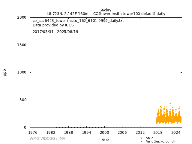 ICOS atmospheric station Observational timeseries of ambient mole fraction of CO in dry air, composed of (all whenever available) historical PI quality-checked data, ICOS Level 2 data and ICOS NRT data. The following uncertainty estimates are used: a. Continuous Measurement Repeatability: monthly average of the standard deviations of short-term target raw data over 1-minute intervals b. Long Term Repeatability: standard deviation of the averaged short-term target measurement intervals (of 10 minutes every 5 hours approximately) over three days c. Short Term Target Bias: difference between the hourly average of the short-term target injections and the value assigned by the calibration lab The method used for "value_unc_1" is "Continuous Measurement Repeatability". The method used for "value_unc_2" is "Long Term Repeatability". The method used for "value_unc_3" is "Short Term Target Bias". More information about the uncertainty estimates can be found in Yver Kwok et al. (2015) (https://doi.org/10.5194/amt-8-3867-2015) and Yver-Kwok et al. (2021) (https://amt.copernicus.org/articles/14/89/2021/). PID: 11676/kFAXjzpuM81DrZPA_42SPt6A Citation: ICOS RI, Bergamaschi, P., Colomb, A., De Mazière, M., Emmenegger, L., Harris, E., Kubistin, D., Lehner, I., Lehtinen, K., Leuenberger, M., Lund Myhre, C., Marek, M.V., O'Doherty, S., Platt, S.M., Plaß-Dülmer, C., Ramonet, M., Schmidt, M., Stanley, K., di Sarra, A., Apadula, F., Arnold, S., Blessing, C., Chen, H., Conil, S., Couret, C., Cristofanelli, P., Di Iorio, T., Forster, G., Frumau, A., Hatakka, J., Heliasz, M., Hensen, A., Hermansen, O., Hoheisel, A., Kneuer, T., Larmanou, E., Laurila, T., Leskinen, A., Levula, J., Lindauer, M., Lopez, M., Lunder, C., Mammarella, I., Manca, G., Manning, A., Marklund, P., Meinhardt, F., Molder, M., Müller-Williams, J., Ottosson-Löfvenius, M., Piacentino, S., Pitt, J., Rivas-Soriano, P., Scheeren, B., Schumacher, M., Sha, M.K., Smith, P., Steinbacher, M., Vermeulen, A., Vítková, G., Ylisirniö, A., Yver-Kwok, C., Zwerschke, E., Arriga, N., Conen, F., Kazan, V., Roulet, Y.-A., Biermann, T., Delmotte, M., Heltai, D., Komínková, K., Laurent, O., Miettinen, P., Montaguti, S., Pichon, J.-M., Sferlazzo, D., Trisolino, P., Zazzeri, G., Blandin, E., Bracci, A., Busetto, M., Bäni, L., Calzolari, F., Elsasser, M., Fratticioli, C., Friedli, J., Fuente-Lastra, M., Gest, L., Grossmann, J., Hanuš, V., Helle, J., Hermans, C., Keronen, P., Kolari, P., Kumps, N., Laitinen, A., Langrene, L., Lanza, A., Legendre, V., Lopez, D., Mandrick, Z., Metzger, J.-M., Rigouleau, L.-J., Schreiber, M., Steger, D., Taipale, R., Weyrauch, D., van den Bulk, P., Álvarez Hernández, A., ICOS Carbon Portal, ICOS Atmosphere Thematic Centre, ICOS Flask And Calibration Laboratory, ICOS Central Radiocarbon Laboratory, 2025. European Obspack compilation of atmospheric carbon monoxide data from ICOS and non-ICOS European stations for the period 2016-2025; obspack_co_466_GVeu_v11.0_20250821. https://doi.org/10.18160/M3VW-DRM5 DATA POLICY: ICOS data is licensed under a Creative Commons Attribution 4.0 international licence (https://creativecommons.org/licenses/by/4.0/). ICOS data licence is described at https://data.icos-cp.eu/licence. |